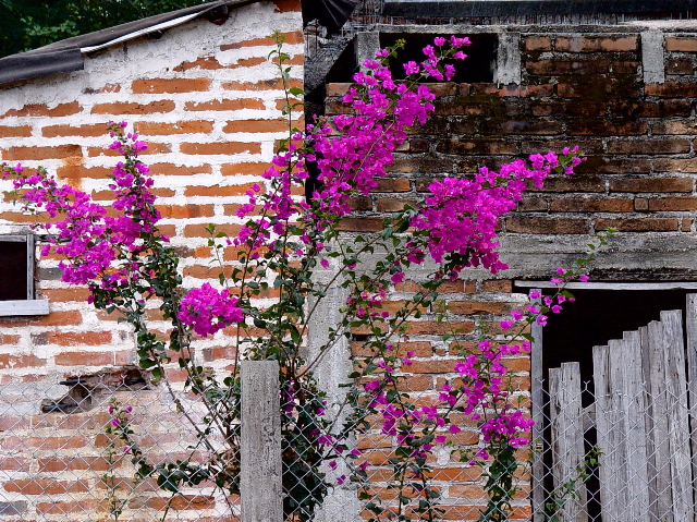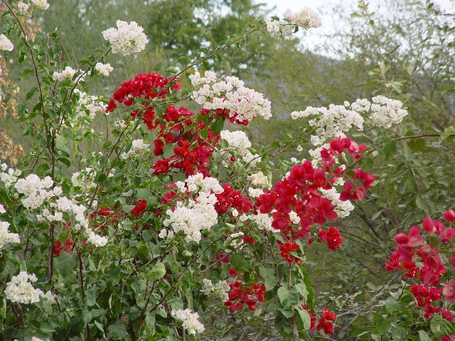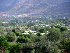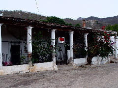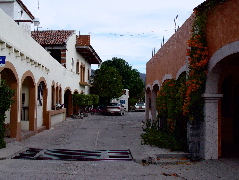 | Heading south, we veered off the main road for our next stop at the lovely old town of Alamos in the foothills of the Sierra Madre Occidental. The collapse of silver mining has left its bougainvillea-draped colonial architecture intact, and even the alleys are bright with flowers. |