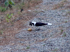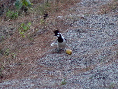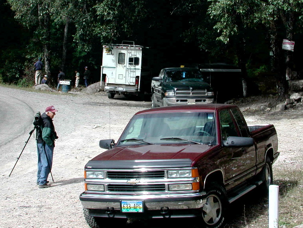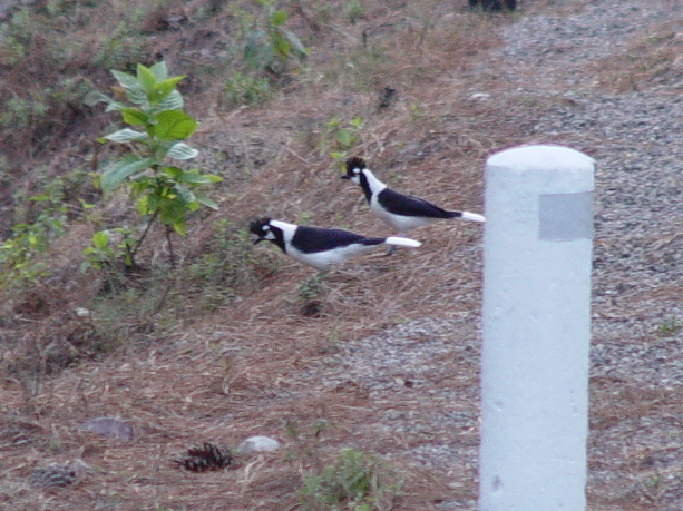 But now, soon after the caravaners coming up from Mazatlan overtook us, the Jays appeared! And instead of just coursing by for brief glimpses, as was usually the case, they swarmed around our parked vehicles at close range and alighted to pick repeatedly at a decaying roadside lemon. This was the kind of rare thrill that birders dream of! |