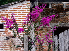 | Heading south, we veered off the main road for our next stop at the lovely old town of Alamos in the foothills of the Sierra Madre Occidental. The collapse of silver mining has left its bougainvillea-draped colonial architecture intact, and even the alleys are bright with flowers. |
